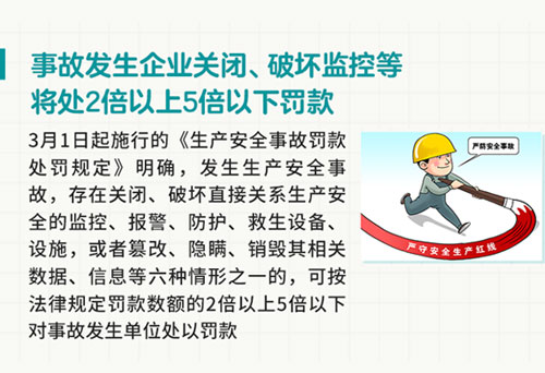 3月1日起施行的《生產(chǎn)安全事故罰款處罰規(guī)定》明確,發(fā)生生產(chǎn)安全事故,存在關(guān)閉、破壞直接關(guān)系生產(chǎn)安全的監(jiān)控、報(bào)警、防護(hù)、救生設(shè)備、設(shè)施,或者篡改、隱瞞、銷(xiāo)毀其相關(guān)數(shù)據(jù)、信息等六種情形之一的,可按法律規(guī)定罰款數(shù)額的2倍以上5倍以下對(duì)事故發(fā)生單位處以罰款...